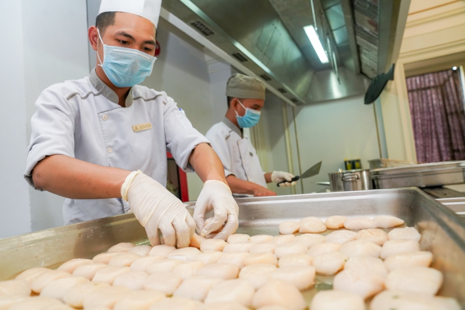 Sò điệp được những đầu bếp chuyên nghiệp của Vinpearl Phú Quốc áp chảo ở nhiệt độ vừa đủ để sò được nguyên vẹn, không vỡ, độ khô vừa phải.