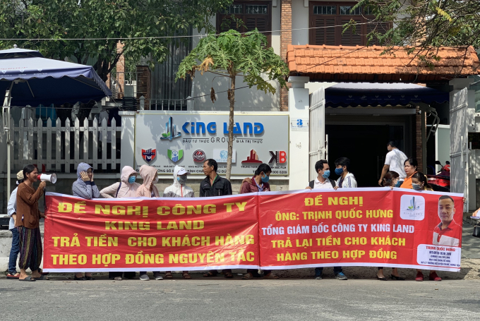 Hàng chục khách hàng căng băng rôn yêu cầu Kingland giao đất theo cam kết hoặc trả lại tiền.
