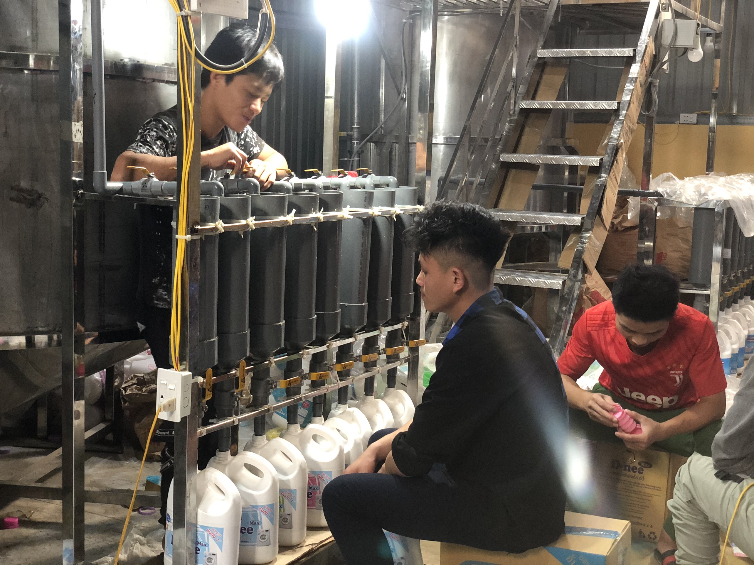 Khai nhận với lực lượng chức năng, chủ cơ sở sản xuất Nguyễn Đăng Đạt cho biết, xưởng sản xuất có 11 công nhân, chia thành 2 ca làm việc. Mỗi ngày, cơ sở sản xuất được 50 thùng, mỗi thùng 4 can. Giá bán buôn theo lời khai ban đầu của Đạt là khoảng 70 ngàn đồng/thùng/can.