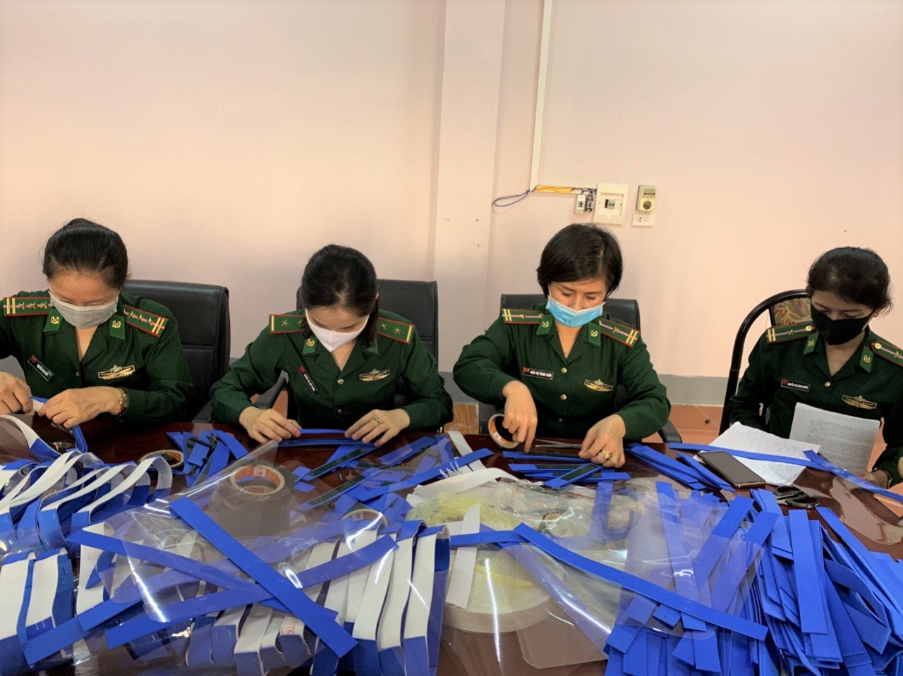 Cùng với pha dung dịch rửa tay khô, Đoàn Thanh niên - Hội Phụ nữ BĐBP Nghệ An còn có sáng kiến mua nguyên vật liệu làm màng chống giọt bắn để gửi tặng lực lượng thực hiện nhiệm vụ trên biên giới. Bởi lực lượng này thường xuyên tiếp xúc với nhiều đối tượng, nên tiềm ẩn nguy cơ lây nhiễm cao. Chỉ trong thời gian ngắn, các đoàn viên thanh niên và hội viên phụ nữ đã “xuất xưởng” được 1000 màng chống giọt bắn chuyển cho các đơn vị trên biên giới.
