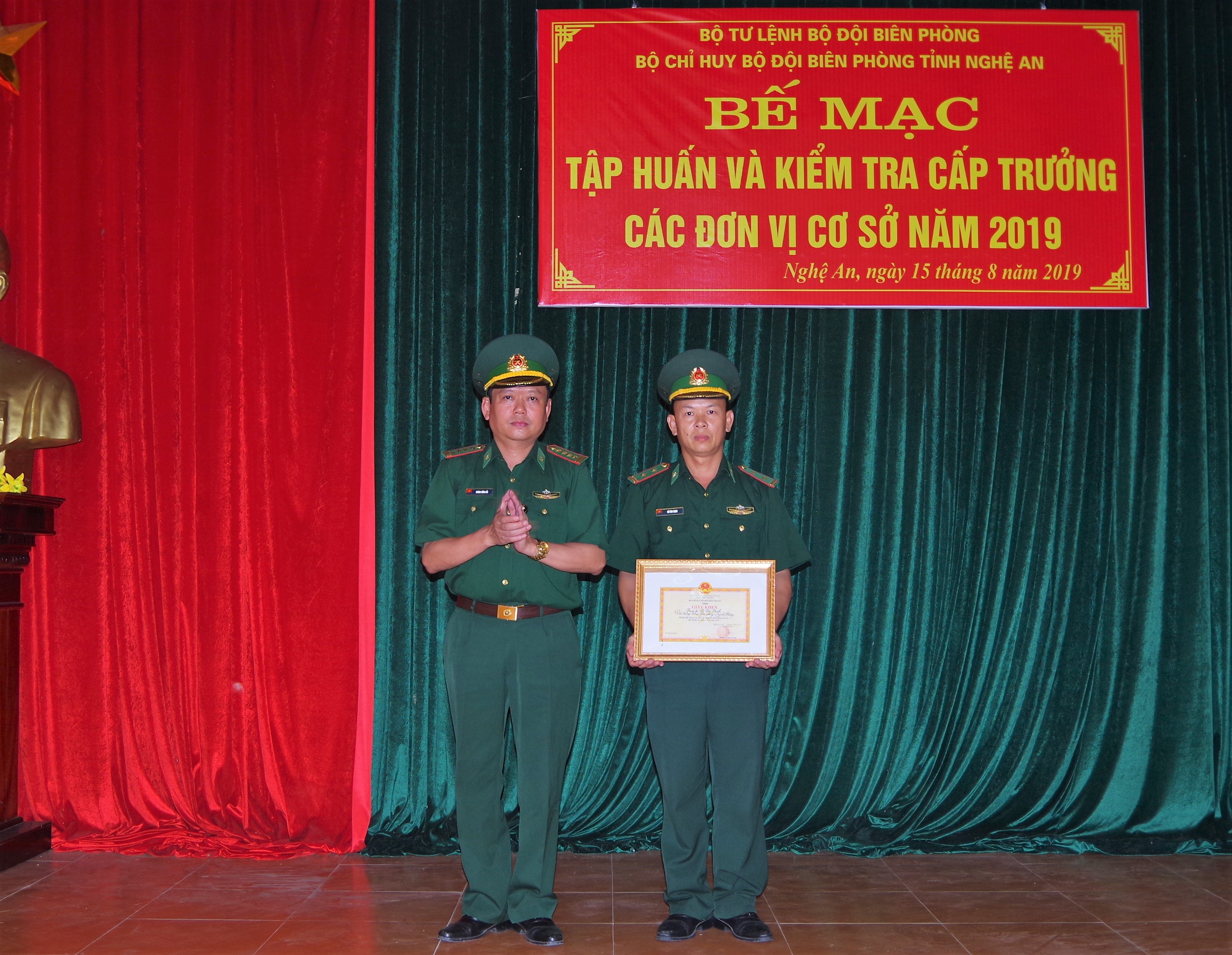 Tại lễ bế mạc, Bộ chỉ huy BĐBP tỉnh Nghệ An đã tặng giấy khen cho Trung tá Hồ Văn Thịnh, Đồn trưởng Đồn BP Quỳnh Phương đạt thành tích cao nhất đợt tập huấn, kiểm tra./.