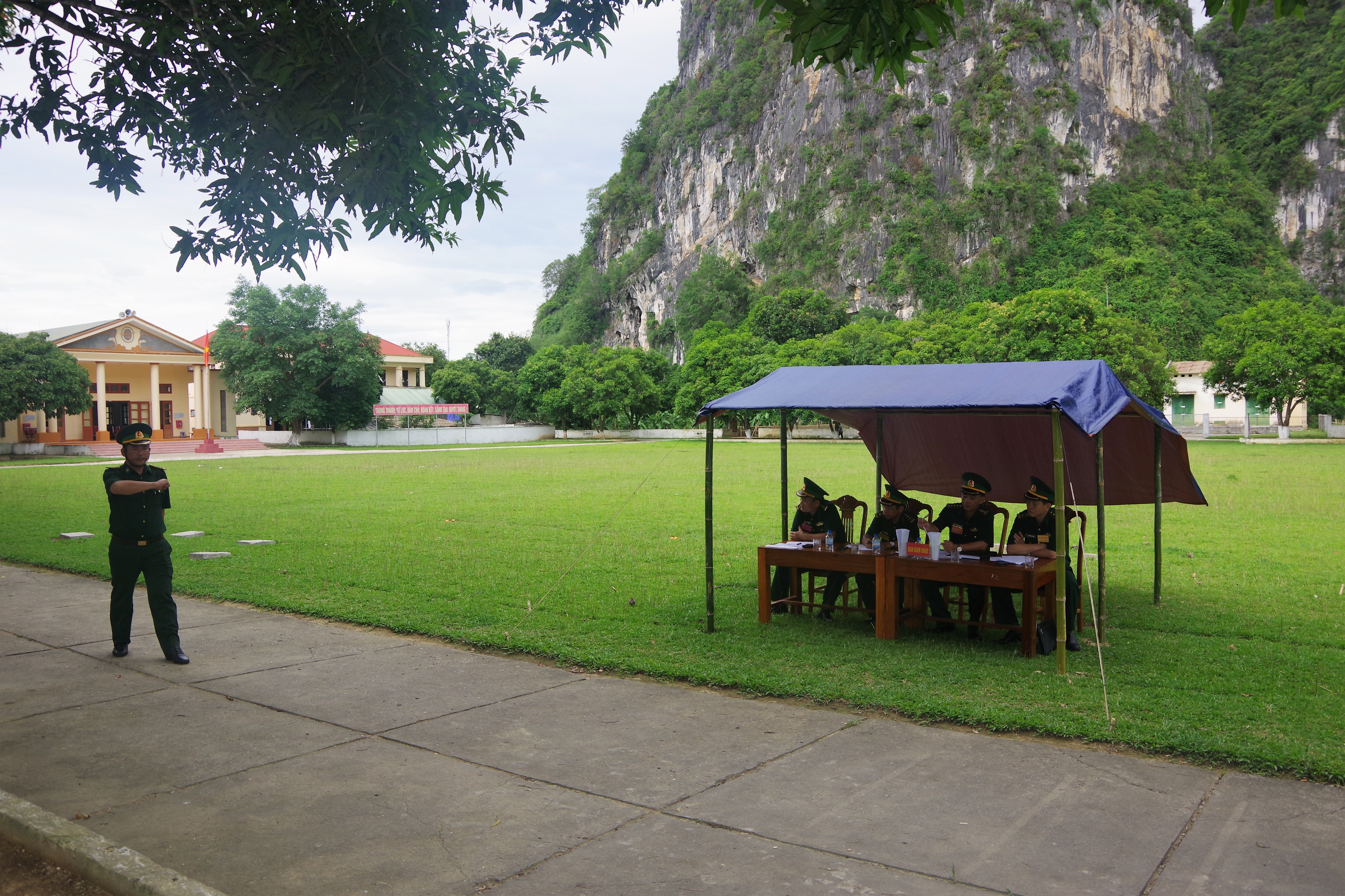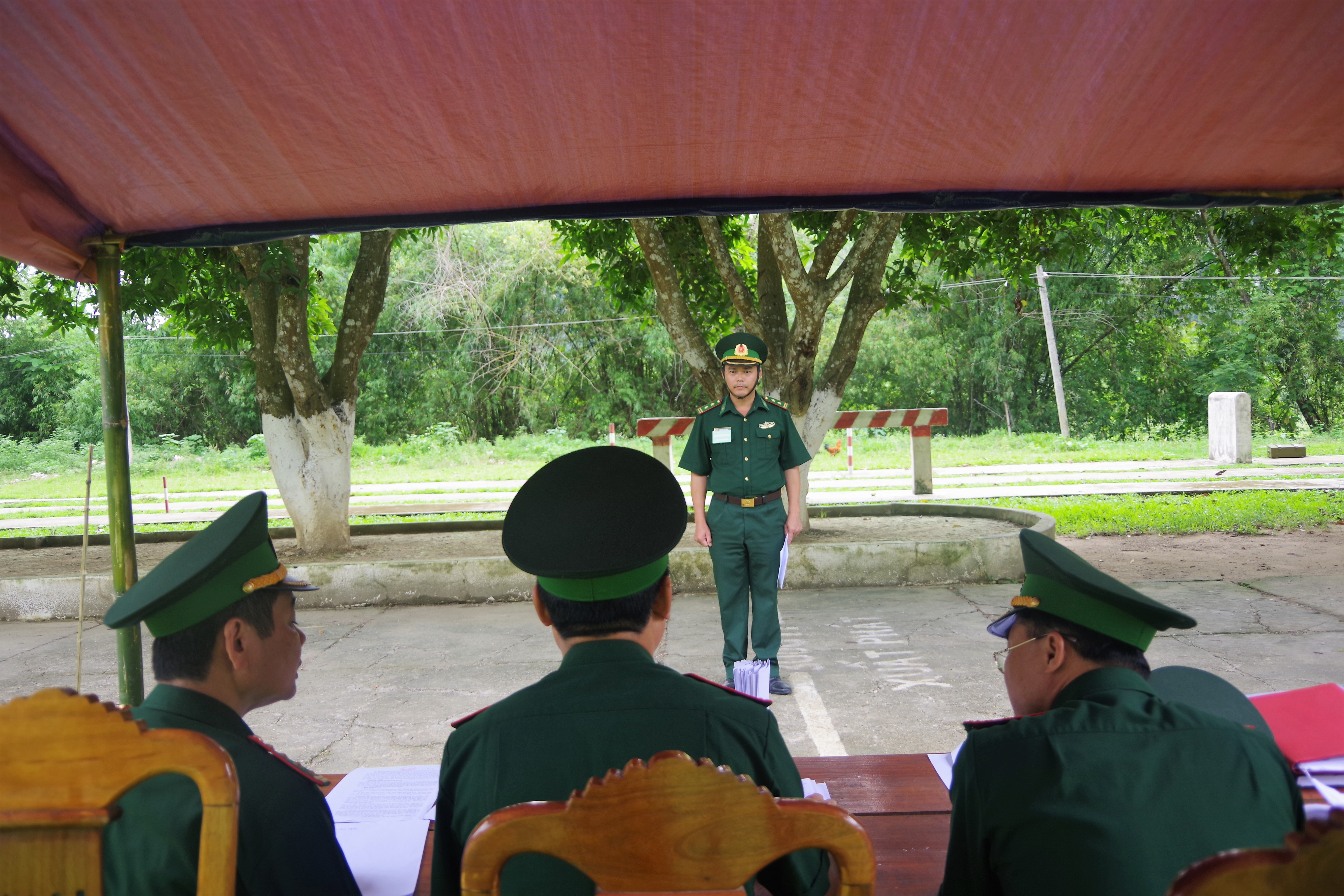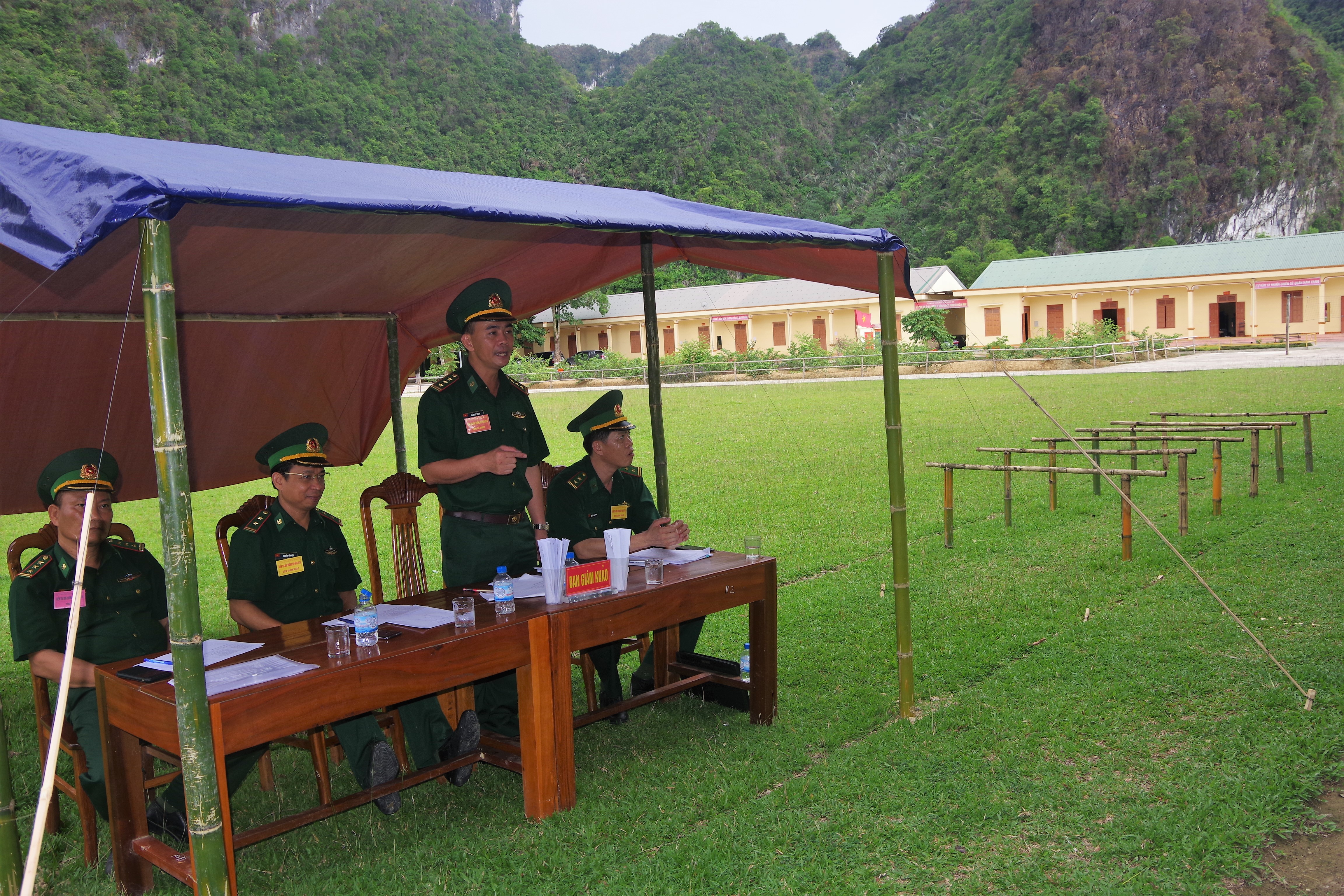 | Ban giám khảo nhận xét phần thi điều lệnh đội ngũ của thí sinh |