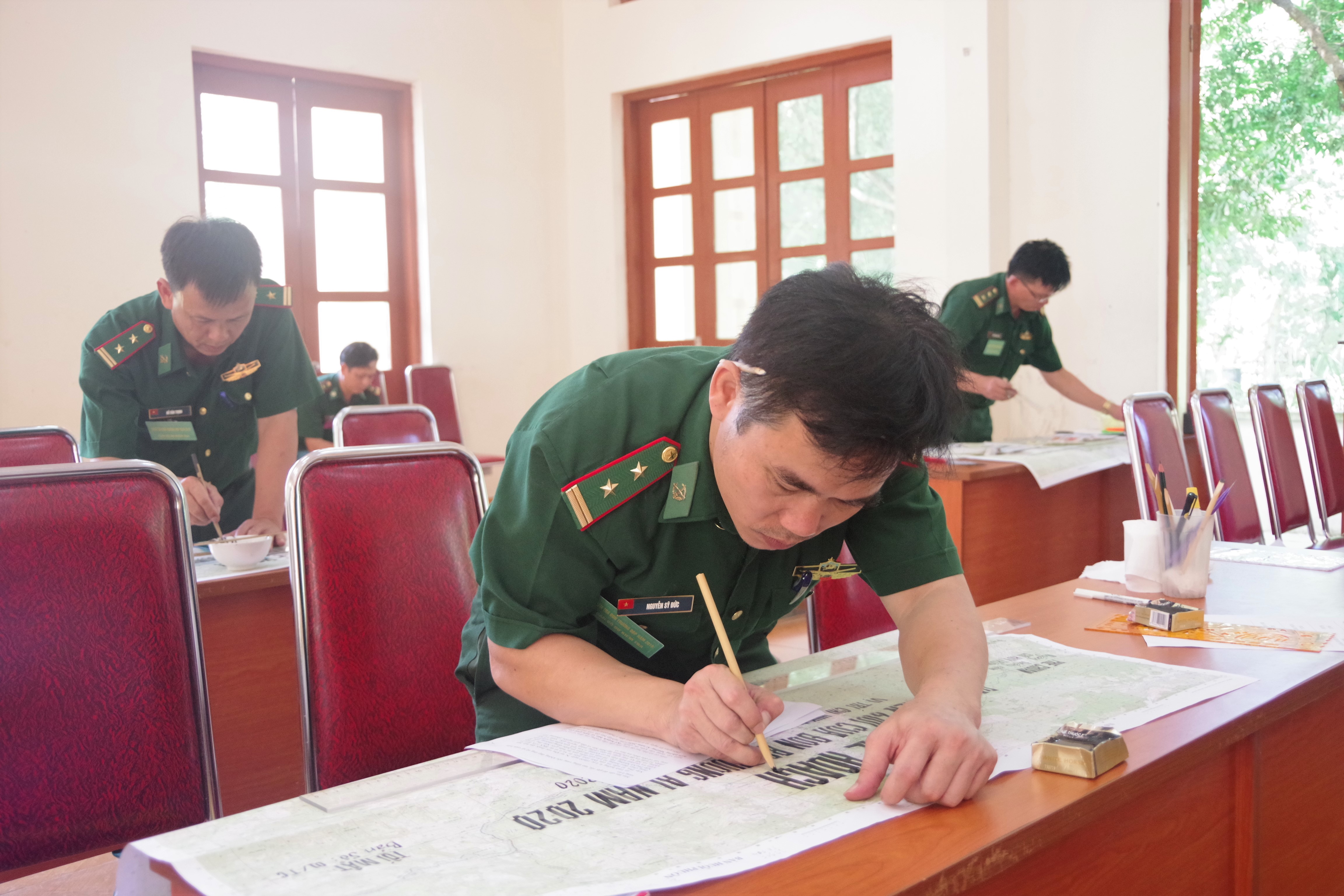 | Các thí sinh soạn thảo văn kiện tác chiến trên bản đồ |
