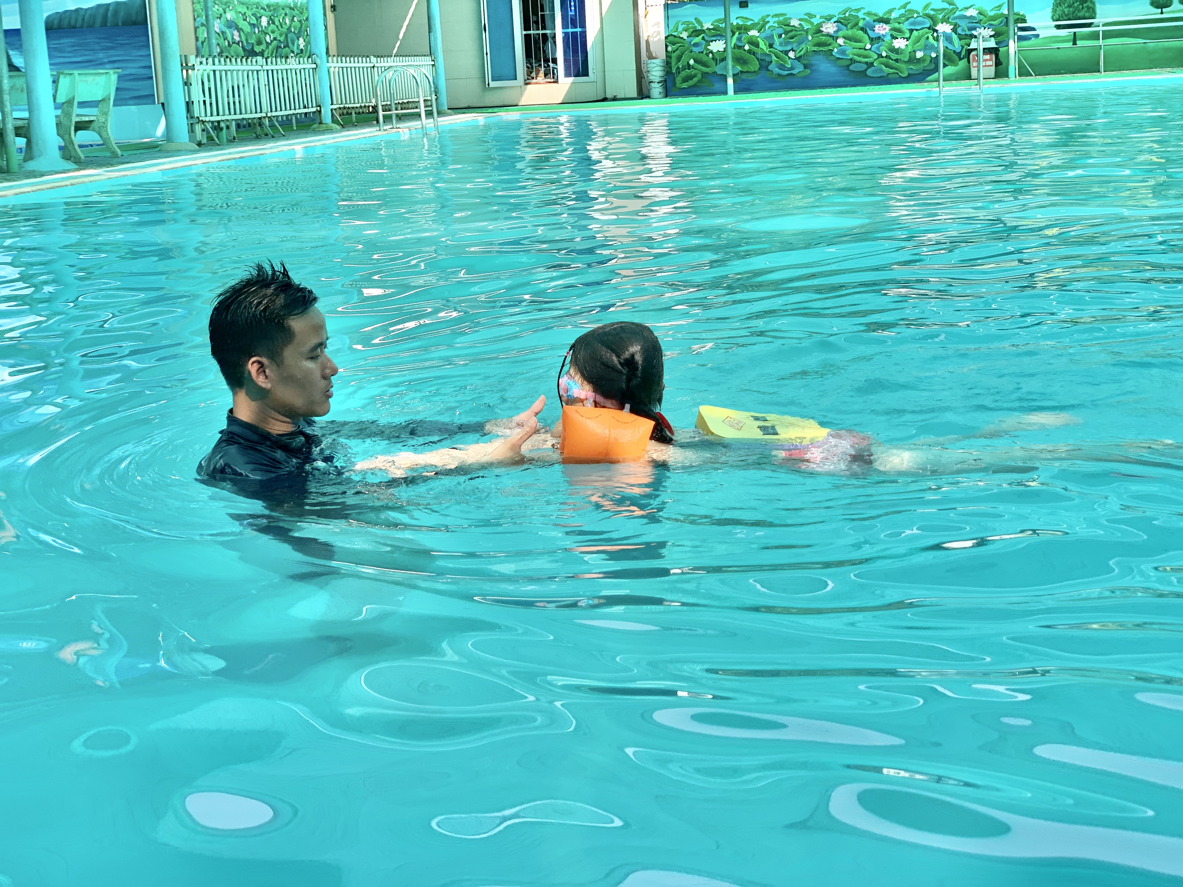 Huấn luyện viên đang hướng dẫn học viên bơi lội tại bể bơi Hồng Hà.