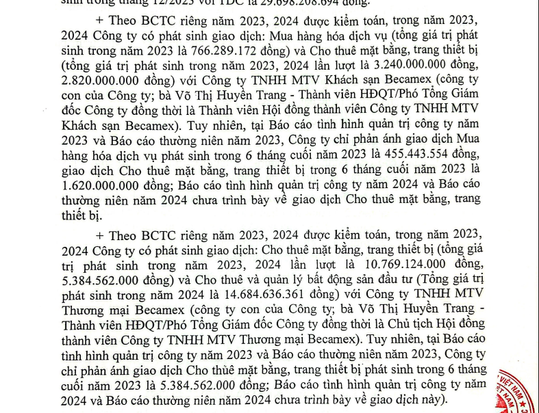 Các giao dịch mua hàng hóa dịch vụ và cho thuê mặt bằng, trang thiết bị với Công ty TNHH MTV Khách sạn Becamex và Công ty TNHH MTV Thương mại Becamex trong năm 2023 và 2024 cũng không được phản ánh đầy đủ trong các báo cáo liên quan.