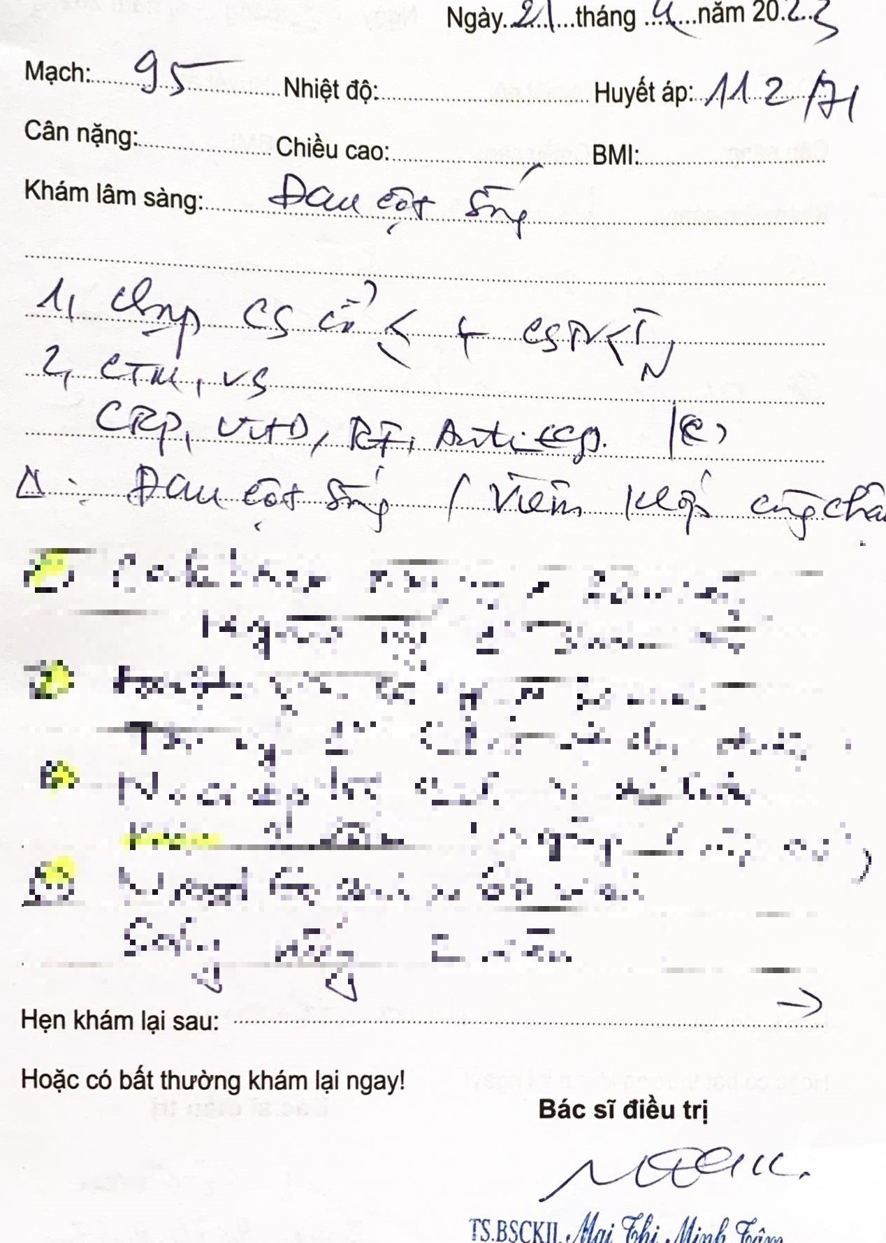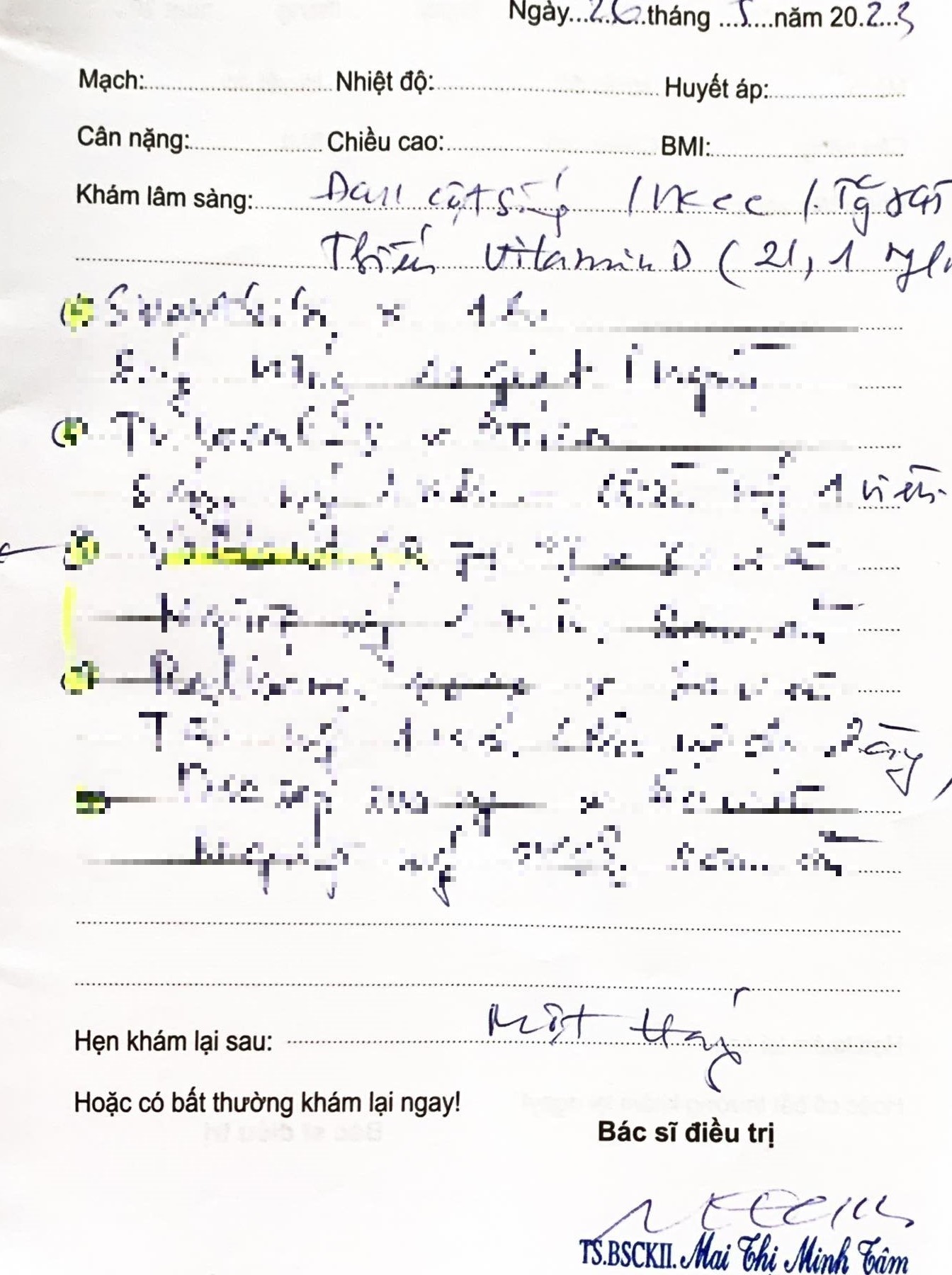 Sau khi mua thuốc, thanh toán các chi phí, chị Tr. về sử dụng thuốc theo đúng đơn bác sĩ đã kê, vậy nhưng các triệu chứng không hề thuyên giảm. Đến cuối tháng 5/2023, tức sau khoảng 1 tháng khám và điều trị theo đơn thuốc của Bệnh viện E, chị Tr. đã đến khám lại. Ở lần khám lại này, chị tiếp tục được bác sĩ Tâm kết luận “đau cột sống, viêm khớp cùng chậu và thiếu vitamin.” Chị tiếp tục được kê đơn thuốc và điều trị hẹn 1 tháng thì đến khám lại. Thắc mắc về việc liệu mình có bị bệnh liên quan đến đốt sống cổ, lưng hay không nhưng bác sĩ khẳng định không có vấn đề.