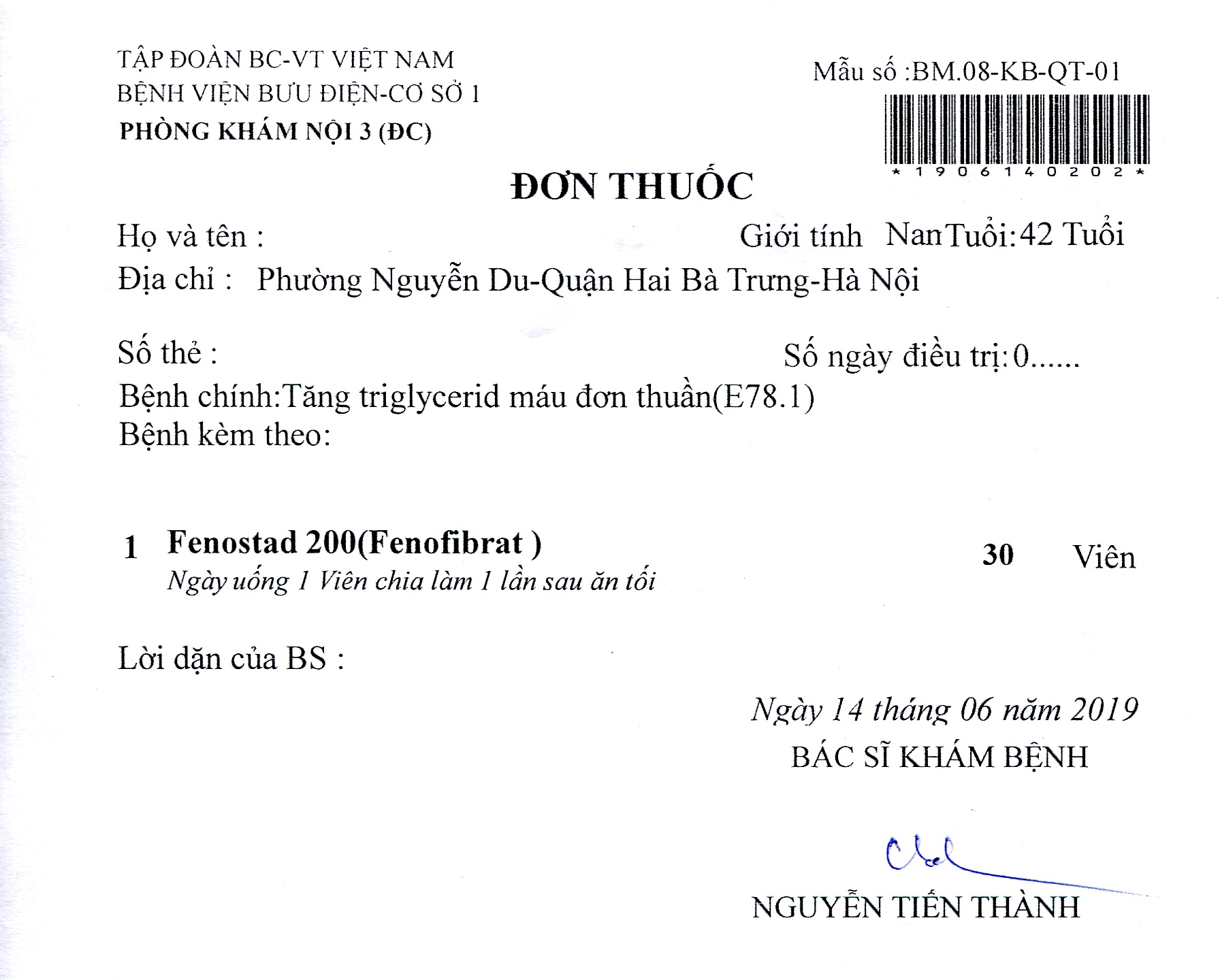 Không tin tưởng vào chuyên môn của bác sỹ Trần Thị Mai, vì không muốn sống trong lo ngại mỡ máu cao sẽ phát sinh nhiều bệnh nguy hiểm, sau khi khám tại bệnh viện Bưu điện cơ sở 2 một tuần, anh H. đã đến bệnh viện Bưu điện tại Định Công (Hà Nội) để tiếp tục kiểm tra mỡ máu. Thật bất ngờ, dù thực hiện đúng lời dặn của bác sỹ Trần Thị Mai về chế độ ăn uống nhưng định lượng Triglycerid trong máu của anh H. đã tăng nhẹ lên mức 2.65. Bất ngờ hơn, bác sỹ khám bệnh là Nguyễn Tiến Thành đã ngay lập tức chỉ định điều trị bằng thuốc Fenostad 200 trong 30 ngày.