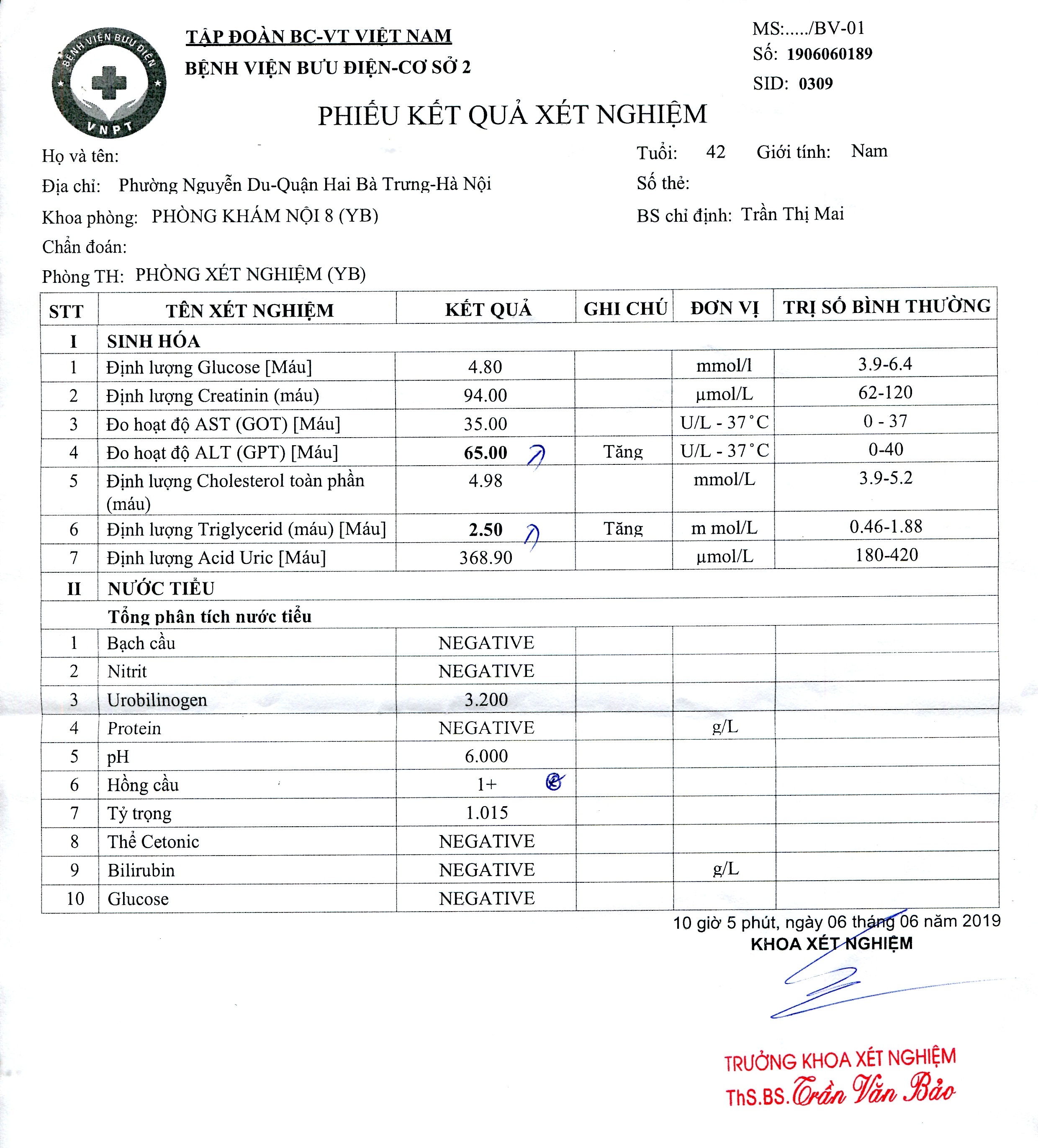 Do cảm thấy cơ thể có biểu hiện bất thường, anh N.M.H đã đến Bệnh viện Bưu điện (cơ sở 2) để khám bệnh theo chế độ bảo hiểm y tế. Kết quả xét nghiệm cho thấy nhiều chỉ số cao bất thường nhưng bác sỹ khám bệnh tại đây không hề có các chỉ định điều trị cần thiết.