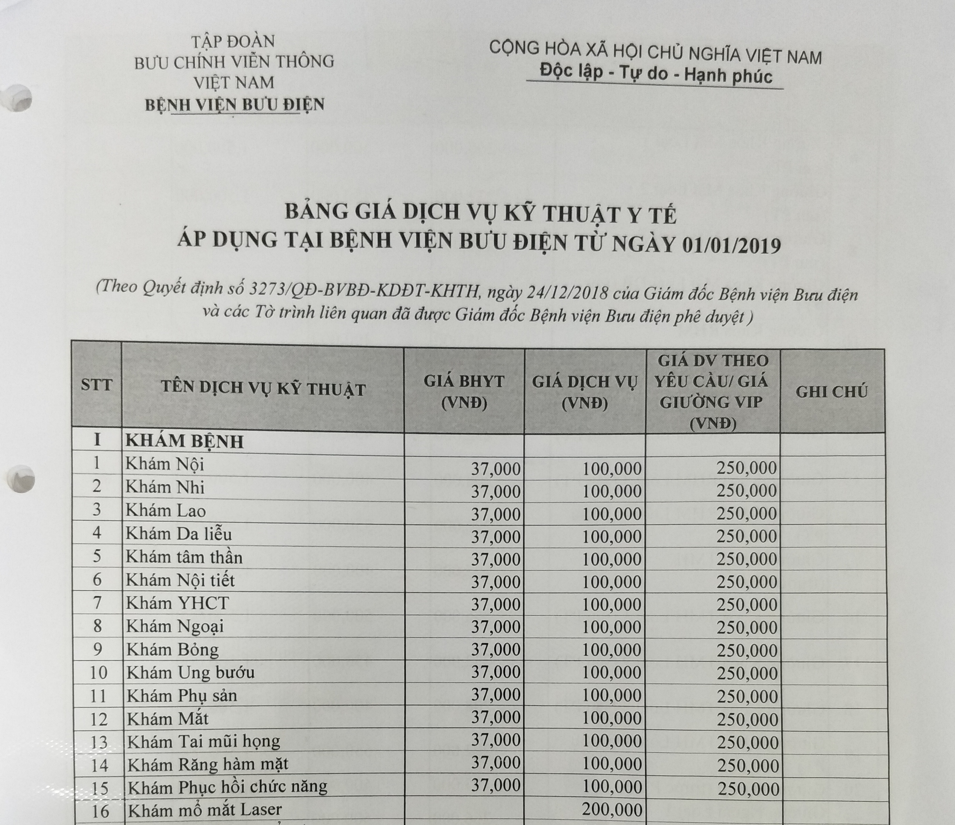 Ngày 24/12/2018, Giám đốc bệnh viện Bưu điện đã có Quyết định số 3273/QĐ-BVBĐ-KDĐT-KHTH về việc ban hành Bảng giá dịch vụ kỹ thuật y tế á dụng tại bệnh viện Bưu điện từ ngày 01/01/2019. Theo quyết định này, trong khi giá bảo hiểm y tế cho dịch vụ khám bệnh nội, nhi, lao, nội tiết, phụ sản… là 37.000 đồng thì bệnh viện Bưu điện áp dụng mức giá dịch vụ là 100.000 đồng; giá dịch vụ theo yêu cầu là 250.000 đồng. Mức giá dịch vụ này được áp dụng cho cả 2 cơ sở của bệnh viện Bưu điện.