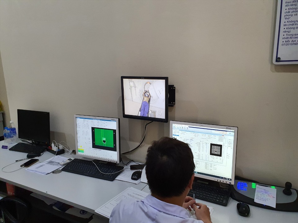 Bác sĩ theo dõi bệnh nhân thăm khám trên hệ thống xạ trị gia tốc được BVĐK Thái Bình mua với giá hơn 100 tỉ đồng. Ảnh: Đình Trường.