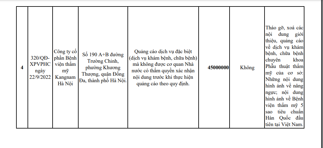 Cụ thể, 22/9, Sở Y tế Hà Nội Quyết định 320/QĐXPVPHC xử phạt hành chính đối với Công ty cổ phần Bệnh viện thẩm mỹ Kangnam Hà Nộ (Số 190 A+B đường Trường Chinh, phường Khương Thượng, quận Đống Đa, thành phố Hà Nội).