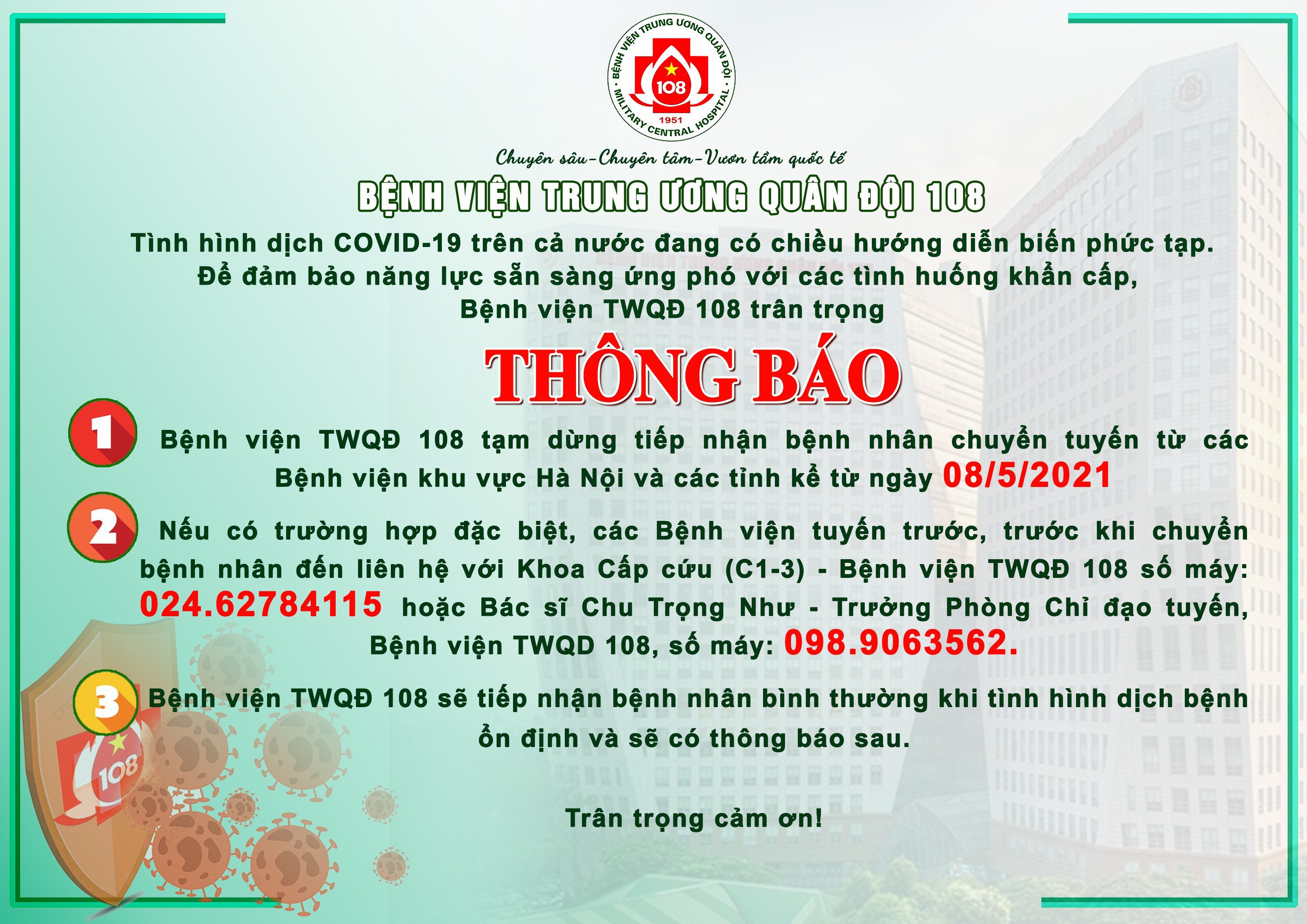 Bệnh viện TW Quân đội 108 tạm dừng tiếp nhận bệnh nhân chuyển tuyến từ các Bệnh viện khu vực Hà Nội và các tỉnh kể từ ngày 08/5/2021.