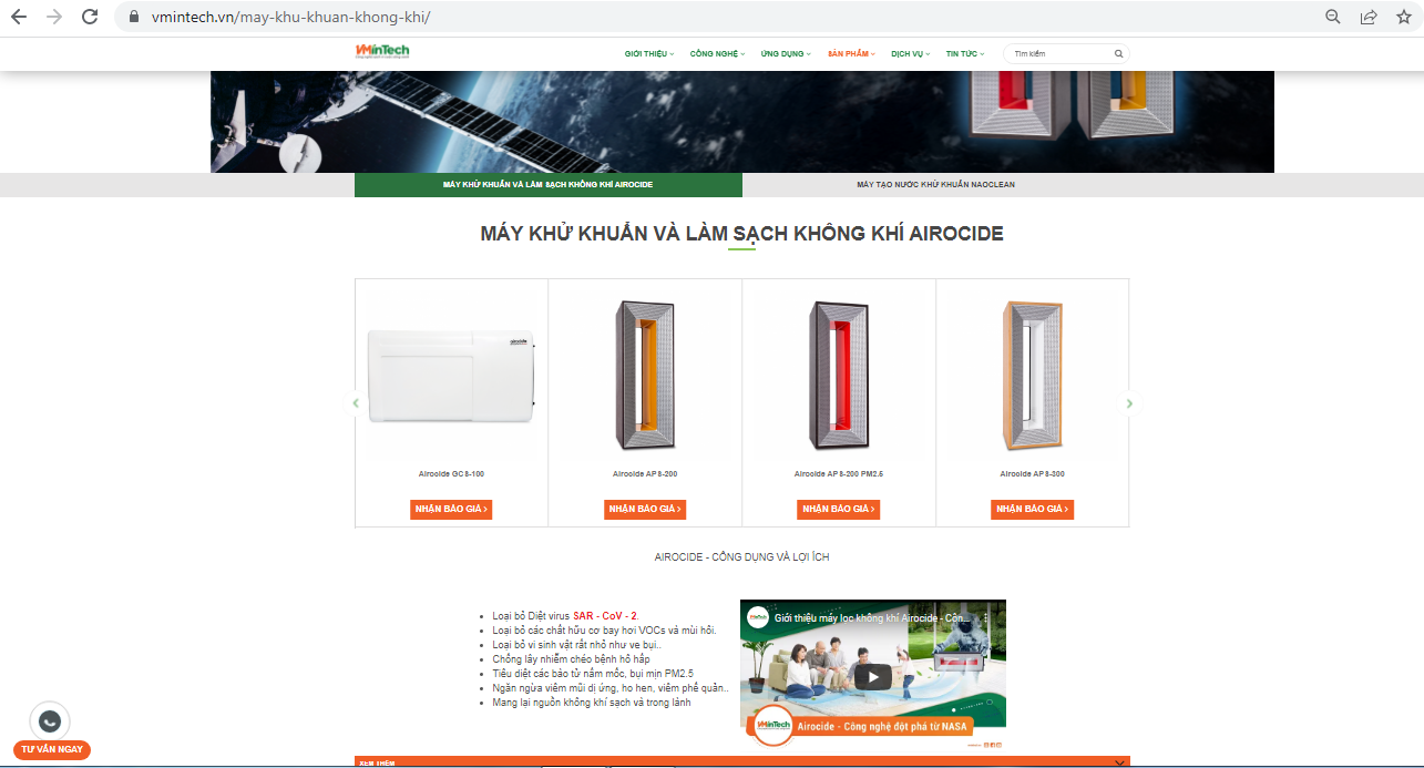 Cụ thể, trên website của Công ty Cổ phần Công nghệ và Thiết bị Việt Mỹ (Địa chỉ: Số 12 Đường ven hồ Hạ Đình, Quận Thanh Xuân, TP.Hà Nội và Số 25, Đào Duy Anh, Phú Nhuận, TP HCM), hàng loạt máy khử khuẩn và lọc không khí vẫn được quảng cáo sử dụng công nghệ Airocide có công dụng "Loại bỏ Diệt virus SARS-CoV-2, Loại bỏ các chất hữu cơ bay hơi VOCs và mùi hôi, Loại bỏ vi sinh vật rất nhỏ như ve bụi, Chống lây nhiễm chéo bệnh hô hấp, Tiêu diệt các bào tử nấm mốc, bụi mịn PM2.5;...".