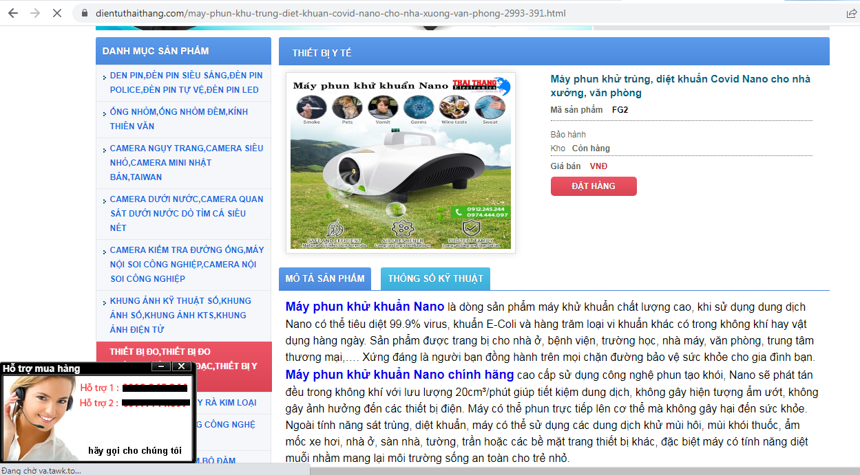Một trường hợp khác cũng nằm trong diện cảnh báo của Cục CT&BVNTD, nhưng theo ghi nhận của PV, trên website của Công ty TNHH Điện tử Thái Thắng (Địa chỉ: Số 12, Ngõ 151, Hồng Hà, Phúc Xá, Ba Đình, TP. Hà Nội), sản phẩm máy phun khử trùng, diệt khuẩn vẫn được giới thiệu là "Máy phun khử trùng, diệt khuẩn COVID Nano cho nhà xưởng, văn phòng" và không được niêm yết giá công khai.