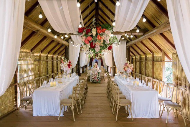 Về không gian tiệc cưới, qua hình ảnh có thể thấy H’Hen Niêc chỉ tổ chức buổi tiệc nhỏ, ấm cúng tại quê nhà Đắk Lắk. Cô bố trí không gian đám cưới ngay trong nhà dài với số lượng ghế ngồi nhất định.