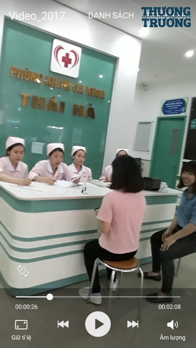 Tại quầy khám bệnh của Phòng khám Đa khoa Thái Hà có tới 4 nhân viên của phòng khám cùng lúc tổ chức tư vấn cho một cô gái còn khá trẻ (ảnh cắt từ clip)