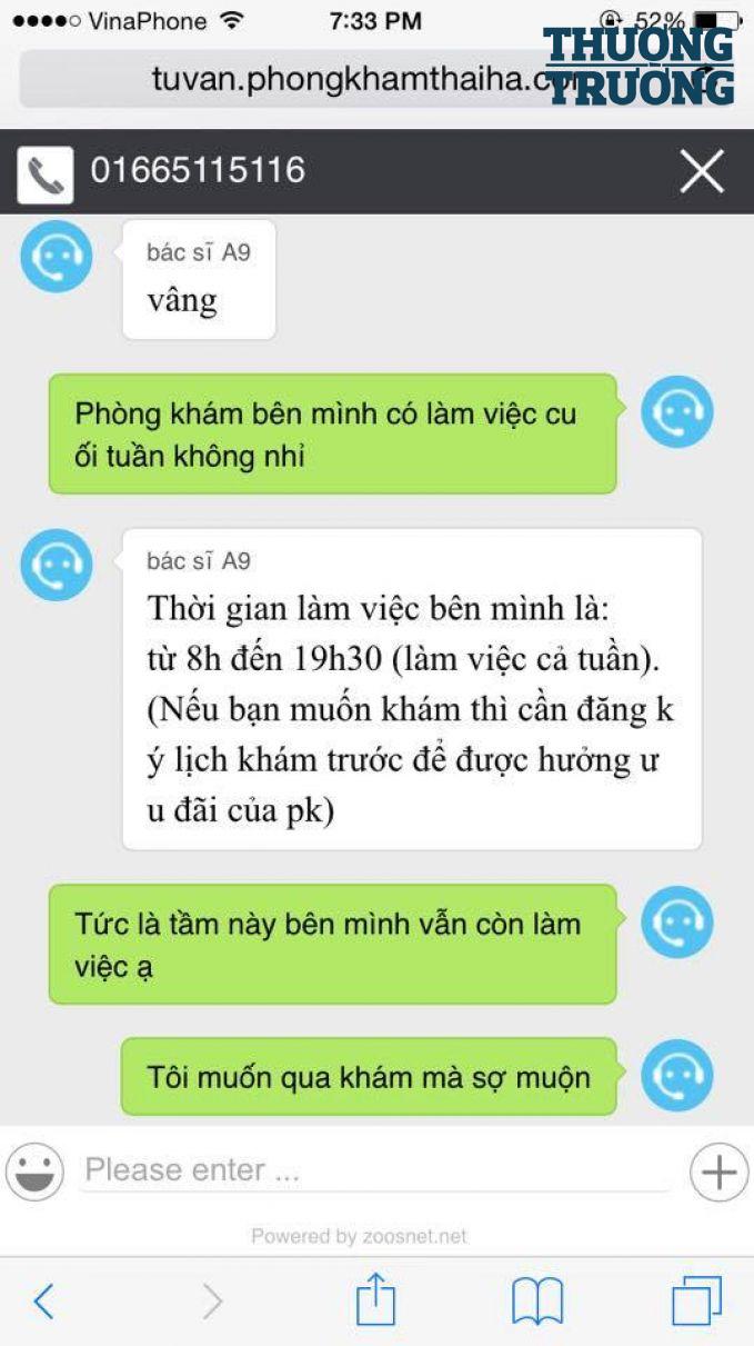 Cũng cùng ngày hôm đó, trong vai bệnh nhân, PV đã nhắn tin cho Phòng khám Đa khoa Thái Hà trên website http://phongkhamthaiha.com/ nhằm xác minh thêm về việc phòng khám này vẫn tiến hành hoạt động. Qua tin nhắn trao đổi, một nhân viên của Phòng khám Đa khoa Thái Hà ở đầu số điện thoại 01665 115 116 cho biết, phòng khám hoạt hoạt động cả tuần (tức không có ngày nghỉ), thời gian làm việc từ 8h đến 19h30.