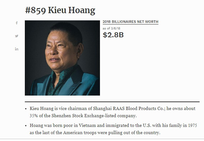 Ông Hoàng Kiều từng nhiều lần lọt trong danh sách tỷ phú của Forbes. Ảnh chụp màn hình Forbes. |