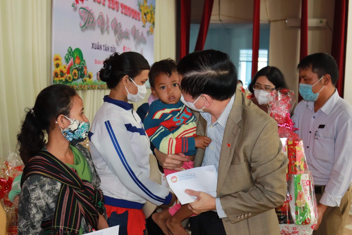 Bí thư tỉnh Đắk Lắk - Bùi Văn Cường cùng Đoàn công tác đã vận động hàng tỷ đồng để mua hàng trăm phần quà trao tặng cho người dân nghèo ở huyện Buôn Đôn và Lắk.