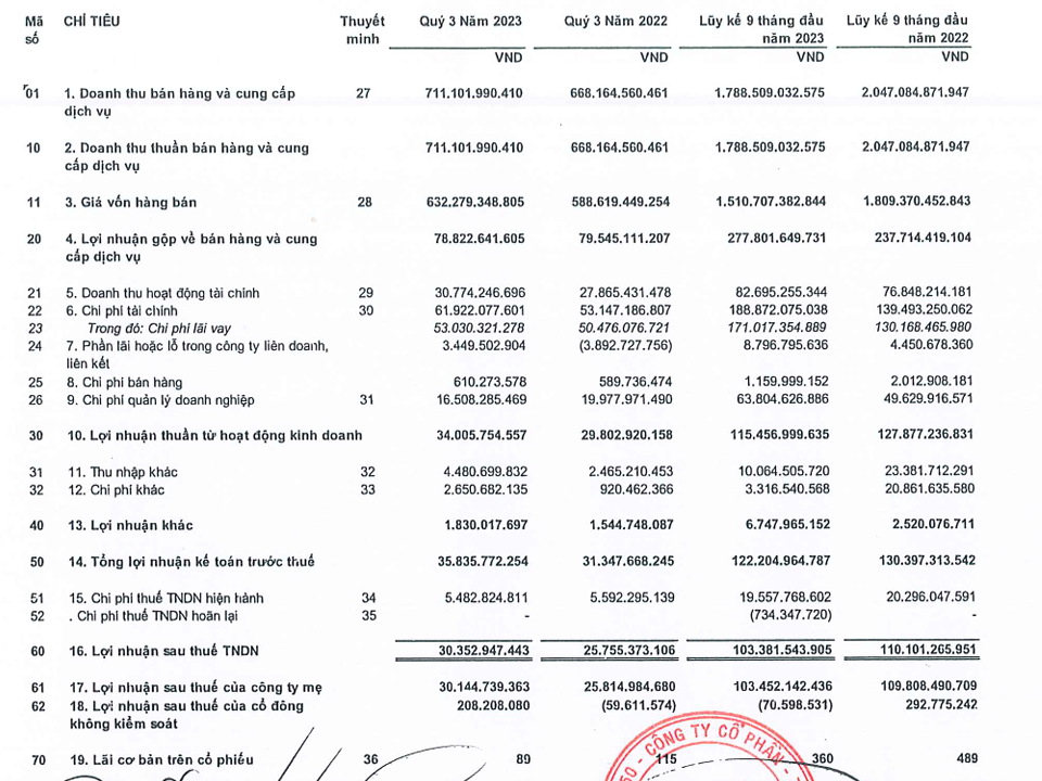 Doanh thu hoạt động tài chính ghi nhận 22,1 tỷ đồng, giảm 28,11%. Tuy nhiên, chi phí lãi vay, giảm 18% xuống còn hơn 43 tỷ đồng, chi phí quản lý doanh nghiệp còn hơn 15,3 tỷ đồng, giảm 17,16%. Kết quả, doanh nghiệp báo lãi sau thuế hơn 55 tỷ đồng, tăng 95% so với cùng kỳ năm 2023.