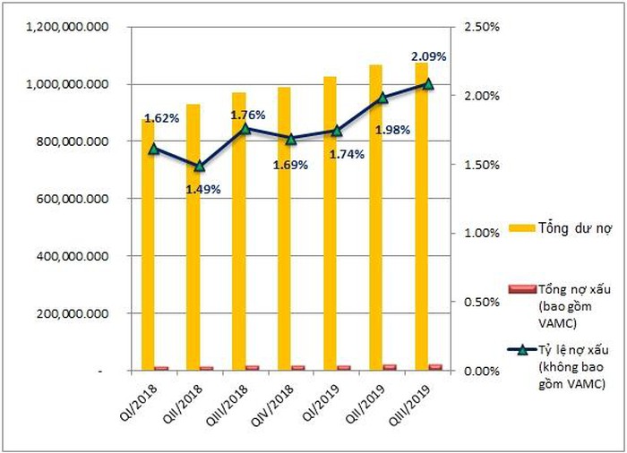 Cụ thể, tỷ lệ nợ xấu (không bao gồm nợ đã bán cho VAMC) ở mức 2,09%, tăng so với mức 1,98% tại thời điểm kết thúc quý II/2019.