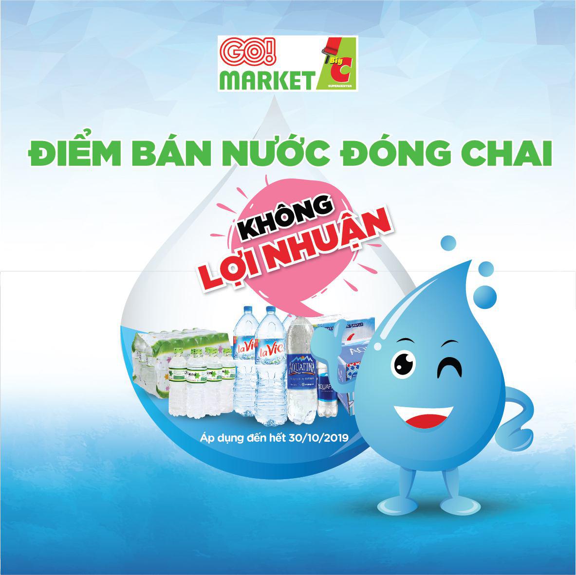 Từ ngày 17/10 đến hết ngày 30/10/2019, tại 5 siêu thị Big C và GO! khu vực Hà Nội (Big C Thăng Long, Big C The Garden, Big C Lê Trọng Tấn, Big C Hồ Gươm, GO! Market Eco Green), áp dụng chương trình bán nước đóng chai không lợi nhuận; khuyến mãi, giảm giá từ 10% đến 30% các sản phẩm nước đóng chai Lavie, Aquafina, Dasami... đang bày bán tại siêu thị.