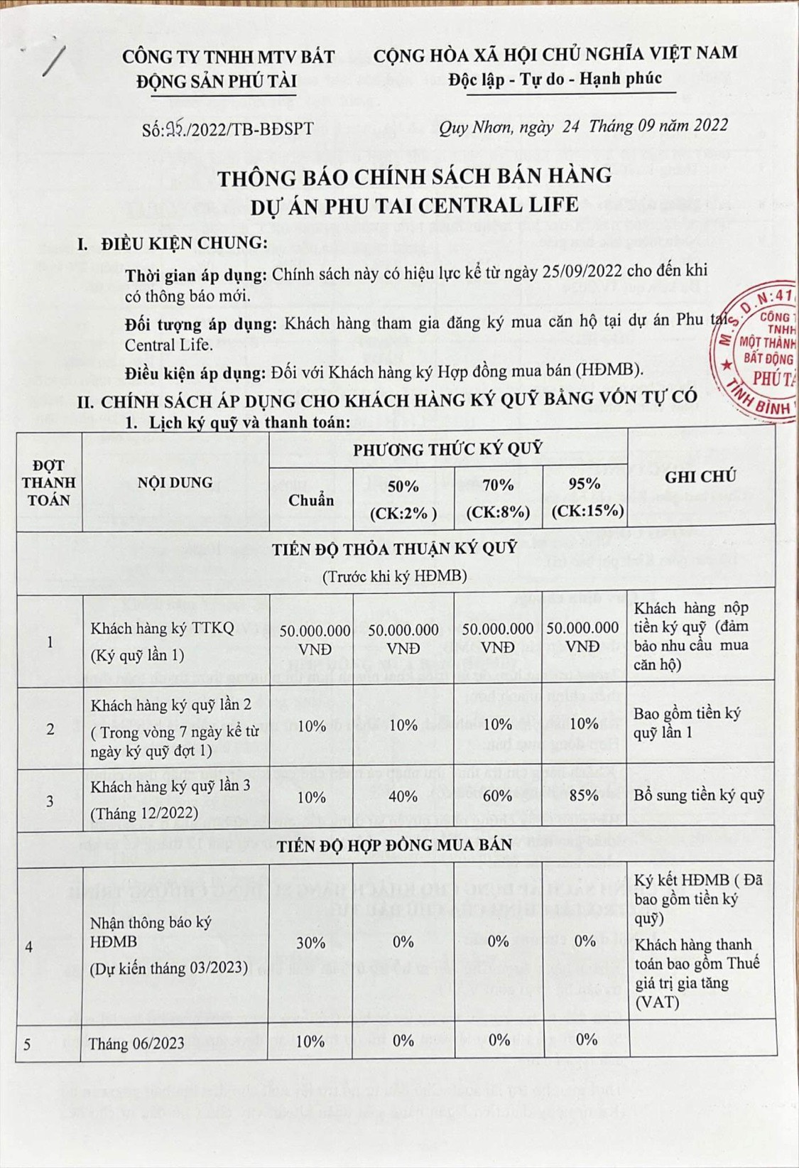 Một phần thông báo chính sách bán hàng dự án Dự án Phú Tài Central Life do ông Hoàng Anh Tuấn – Giám đốc Công ty TNHH Một Thành Viên Bất động sản Phú Tài ký ngày 24/9/2022