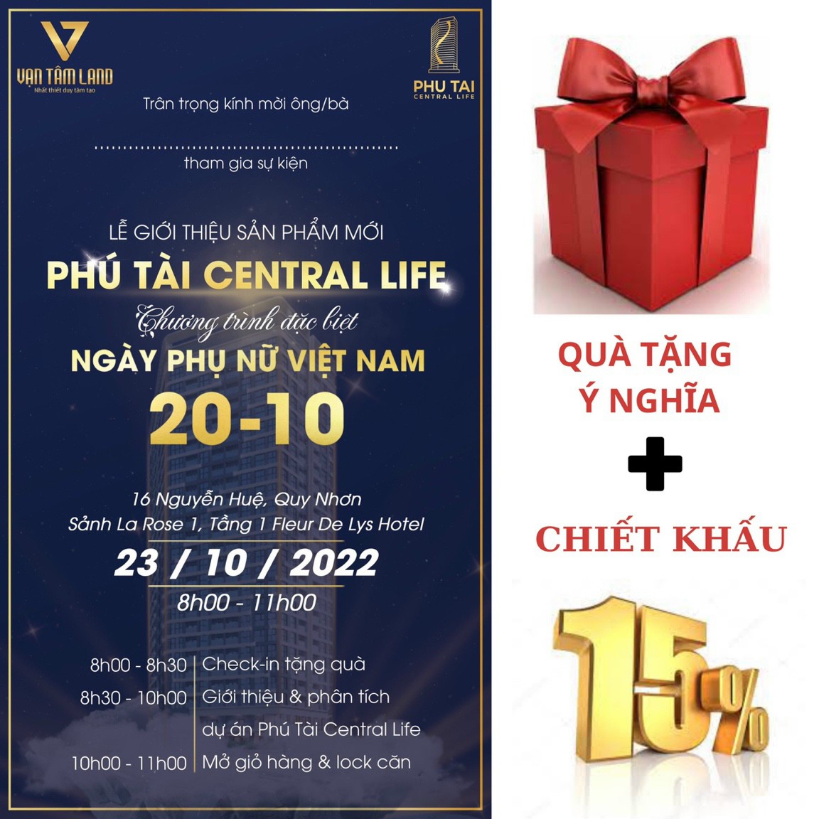 Tiếp đó, ngày 23/10, các khách hàng lại được mời tới “Lễ giới thiệu sản phẩm mới Phú Tài Central Life” tại Khách sạn Fleur De Lys Hotel Quy Nhơn, số 16 Nguyễn Huệ, TP. Quy Nhơn. Tại lễ giới thiệu lần này có cả chương trình “Mở giỏ hàng và lock căn”.