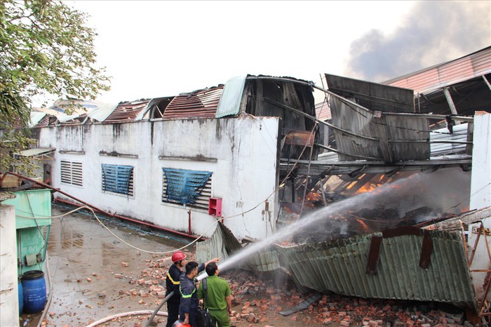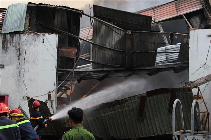 Đến 11h30 cùng ngày, ngọn lửa vẫn đang bùng lên. Quan sát tại hiện trường, một nhà xưởng rộng khoảng 1.000m² đã bị thiêu rụi, mái tôn đổ sụp.
