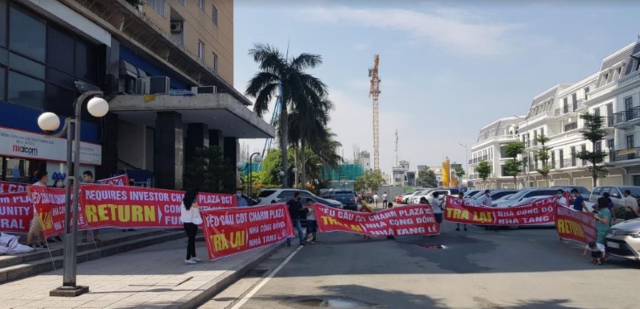Cư dân Charm Plaza giăng băng rôn, tố chủ đầu tư chiếm dụng nhà sinh hoạt cộng đồng chung.Theo cư dân tại đây, kể từ khi bàn giao nhà vào năm 2012 đến nay, mục đích của tầng G lại được chủ đầu tư sử dụng cho thuê làm phòng tập gym, siêu thị mi ni, nhà hàng, văn phòng làm việc và gần đây là xây dựng nhà mẫu cho một dự án mới của chủ đầu tư này mang tên Charm City.