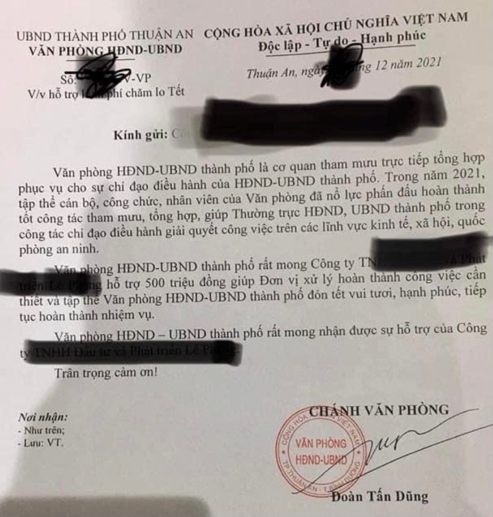 Trước đó, trên mạng xã hội xuất hiện một văn bản được cho là của Văn phòng HĐND-UBND TP. Thuận An, Bình Dương xin doanh nghiệp hỗ trợ 500 triệu đón Tết khiến dư luận xôn xao.