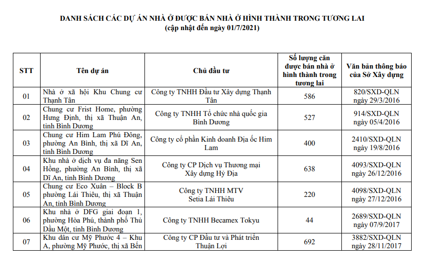 Sở Xây dựng tỉnh Bình Dương vừa công bố danh sách mới nhất những dự án được phép huy động vốn nhà ở hình thành trong tương lai.