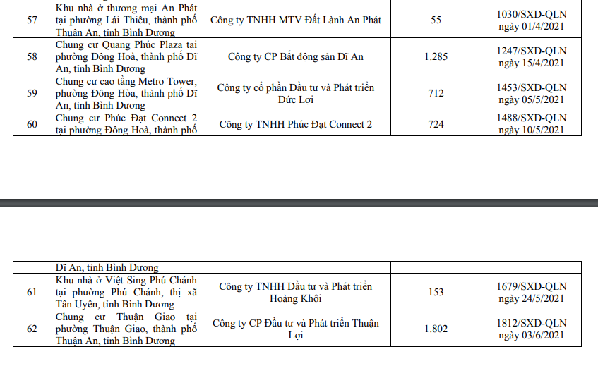 Theo đó, tính đến ngày 01/7/2021, trên địa bàn tỉnh Bình Dương có 62 dự án được bán nhà ở hình thành trong tương lai, tổng số căn được mở bán đợt này tới 32.310 căn nhà ở, căn hộ dịch vụ thương mại.