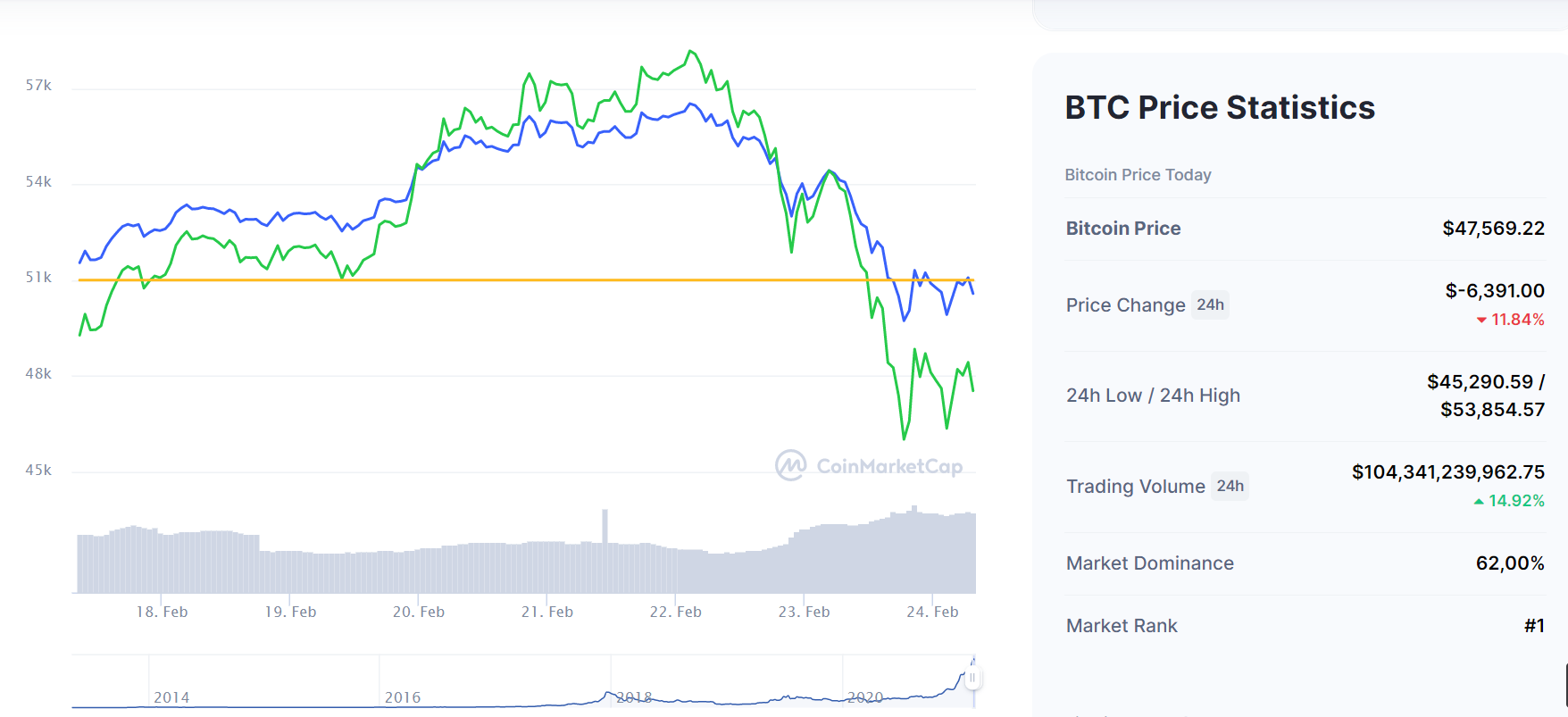 Lúc 7 giờ 30 ngày 24/2, giá Bitcoin theo ghi nhận của Coinmarketcap rớt xuống mức 47.253 USD, giảm gần 12 trong vòng 24 giờ qua và giá trị vốn hóa của đồng tiền này chỉ còn 992.3 tỉ USD.