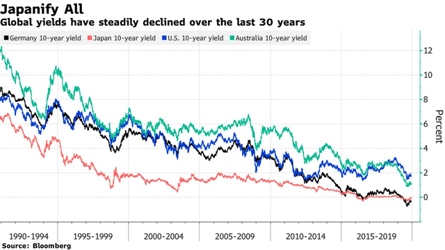 Đầu tiên là Nhật Bản, sau đó đến châu Âu. Giờ đây các nhà đầu tư đang theo dõi sát sao mọi dấu hiệu bùng phát tiếp theo của tình trạng lạm phát trì trệ và lợi suất sụt giảm mạnh. Năm nay, cụm từ "Japanification" (Nhật Bản hoá) đã trở nên phổ biến, khi số lượng trái phiếu lợi suất âm chạm mức kỷ lục.