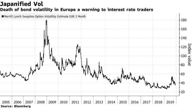Các chỉ số đo lường biến động đều cho thấy các nhà giao dịch quyền chọn đang đặt cược dài hạn về lãi suất thấp. Sau một đợt tăng đột biến hồi tháng 8 và tháng 9, trong bối cảnh chiến tranh thương mại nóng lên, một chỉ số đo lường mức giá của Merrill Lynch tại thị trường trái phiếu chính phủ châu Âu hiện đang quay trở lại mức thấp nhất mọi thời đại.