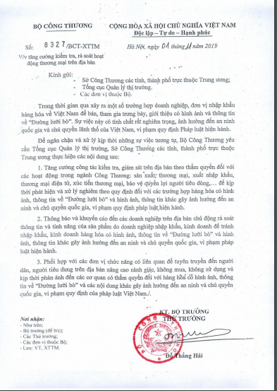 Công văn yêu cầu các đơn vị thuộc Bộ và các Sở Công Thương tăng cường kiểm tra, rà soát hoạt động thương mại, nhập khẩu hàng hóa về Việt Nam để bán, tham gia trưng bày, giới thiệu... có hình ảnh và thông tin về “Đường chín đoạn" ("Đường lưỡi bò")