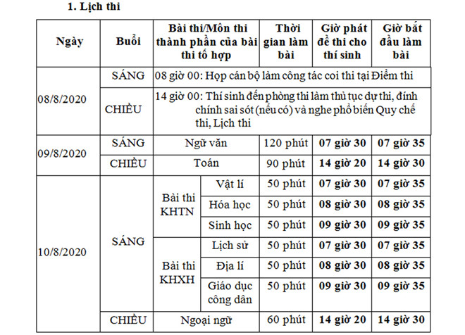 Trước đó, ngày 5/6, Bộ GD-ĐT ban hành quy chế thi tốt nghiệp THPT năm 2020, kỳ thi sẽ được tổ chức 2 ngày 9 và 10/8 thay vì 2,5 ngày như trước đây. Kỳ thi được sử dụng để xét công nhận tốt nghiệp THPT, phục vụ đánh giá chất lượng giáo dục phổ thông và xét tuyển ĐH, CĐ.