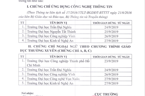 Như vậy, theo danh sách có 3 trường là: Đại học Trần Đại Nghĩa, Đại học Công nghiệp Vinh và Đại học Kinh tế Nghệ An phải dừng việc tổ chức kiểm tra, sát hạch, cấp cả chứng chỉ ngoại ngữ và chứng chỉ ứng dụng công nghệ thông tin. 3 trường còn lại được yêu cầu dừng cấp 1 trong 2 loại chứng chỉ này.