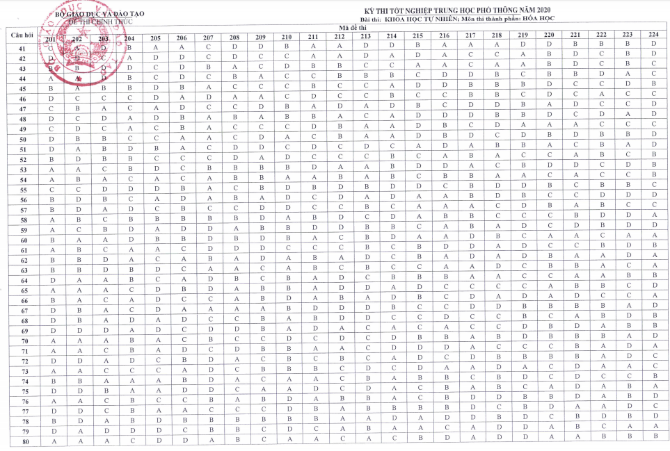 Đáp án đề thi môn Hóa Học THPT Quốc gia năm 2020.