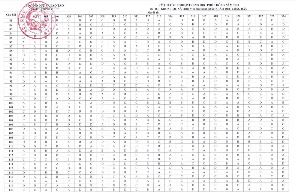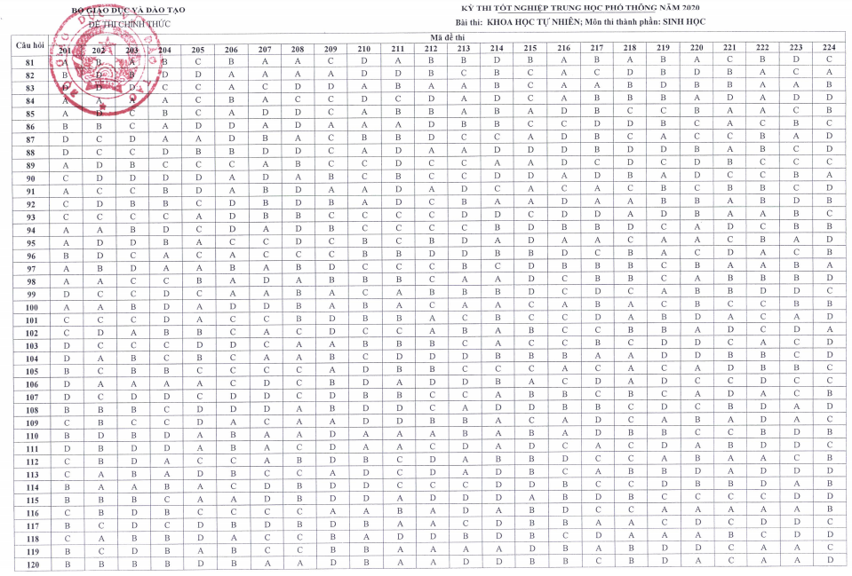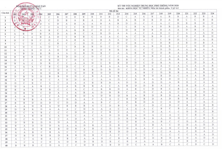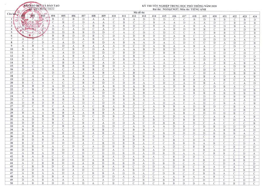 Chiều 12/8, bộ Giáo dục và Đào tạo công bố đáp án chính thức đề thi tốt nghiệp THPT 2020. Dưới đây là tổng hợp đáp án chính thức tất cả các môn thi tốt nghiệp THPT năm 2020.