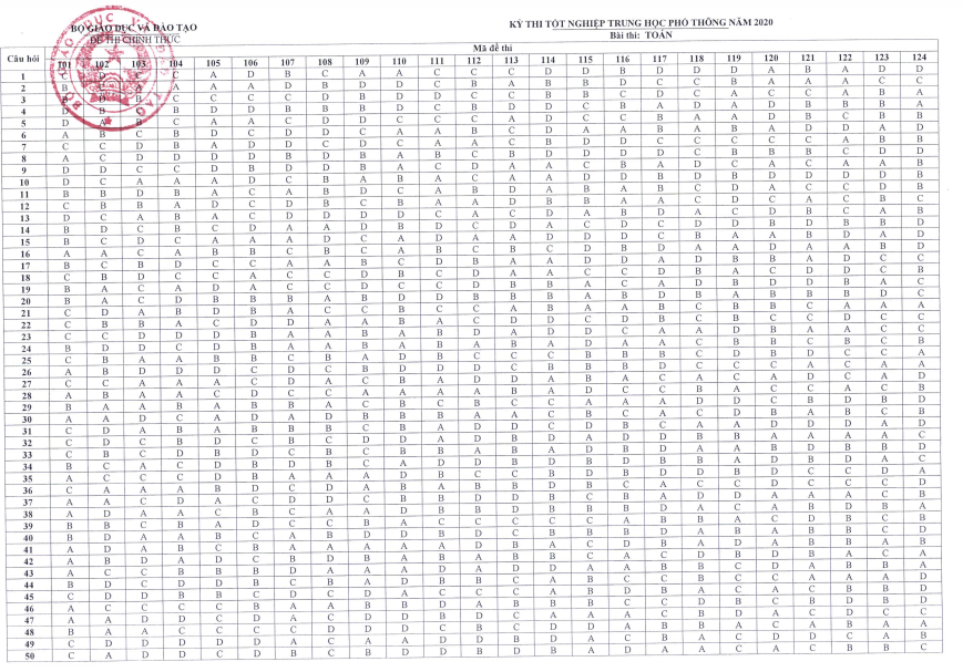 Đáp án đề thi môn Toán THPT Quốc gia năm 2020.