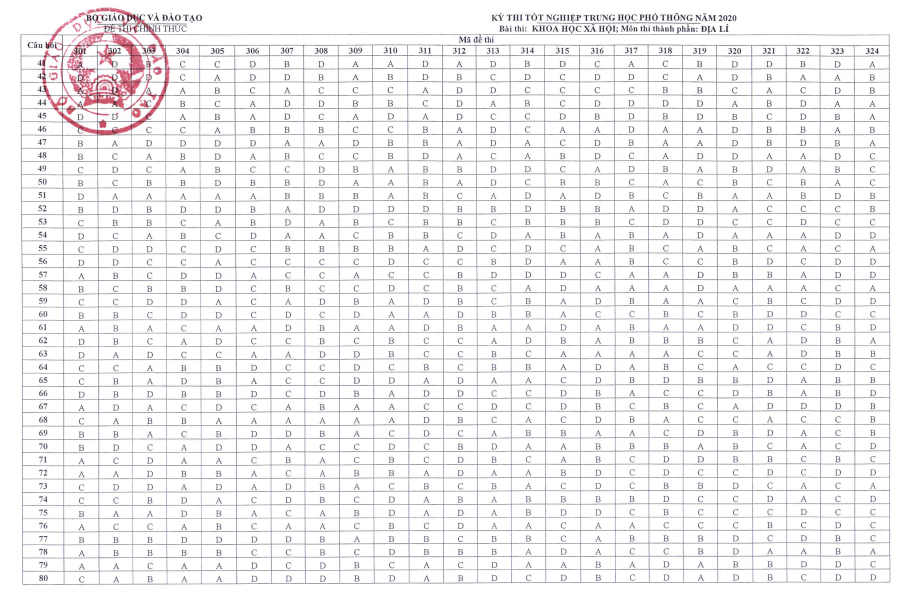 Đáp án đề thi môn Địa Lý THPT Quốc gia năm 2020.