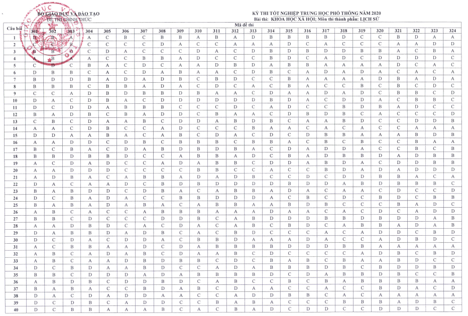 Đáp án đề thi môn Lịch Sử THPT Quốc gia năm 2020.