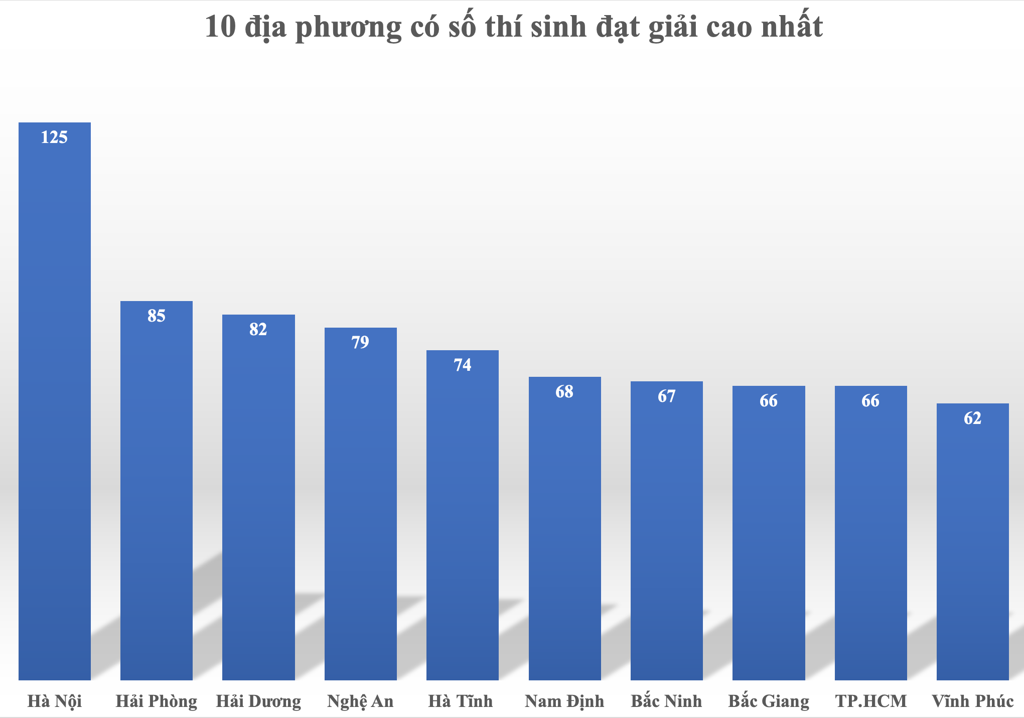 Xét trên tổng số giải, Hà Nội dẫn đầu cả nước về số lượng thí sinh, với 125 giải; tiếp đến là Hải Phòng (85 giải), Hải Dương (82 giải), Nghệ An (79 giải), Hà Tĩnh (74 giải).