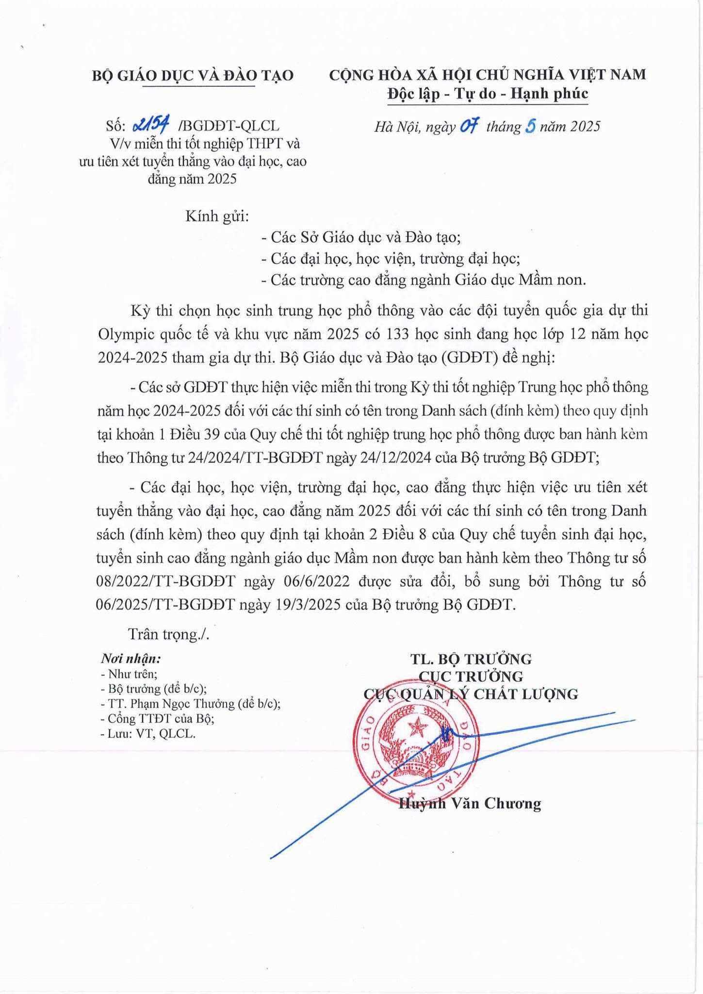 Bộ GDĐT vừa công bố danh sách học sinh xuất sắc miễn thi TN ưu tiên xét tuyển Đại học 2025