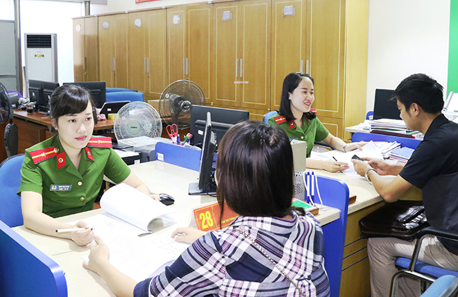 Cán bộ Công an làm các thủ tục hành chính phục vụ người dân.