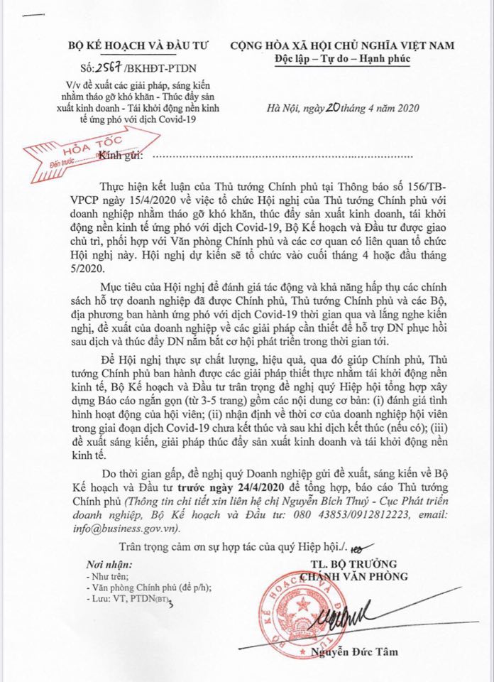 Do thời gian gấp, Bộ Kế hoạch và Đầu tư đề nghị các Hiệp hội, doanh nghiệp gửi đề xuất, sáng kiến về Bộ Kế hoạch và Đầu tư trước ngày 24/4/2020 để tổng hợp, báo cáo Thủ tướng Chính phủ.