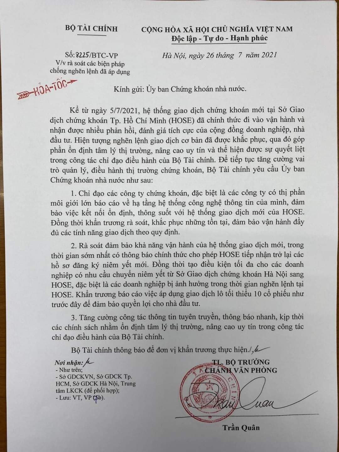 Bộ Tài chính có văn bản gửi Ủy ban Chứng khoán Nhà nước (UBCKNN) về việc rà soát các biện pháp chống nghẽn lệnh đã áp dụng.