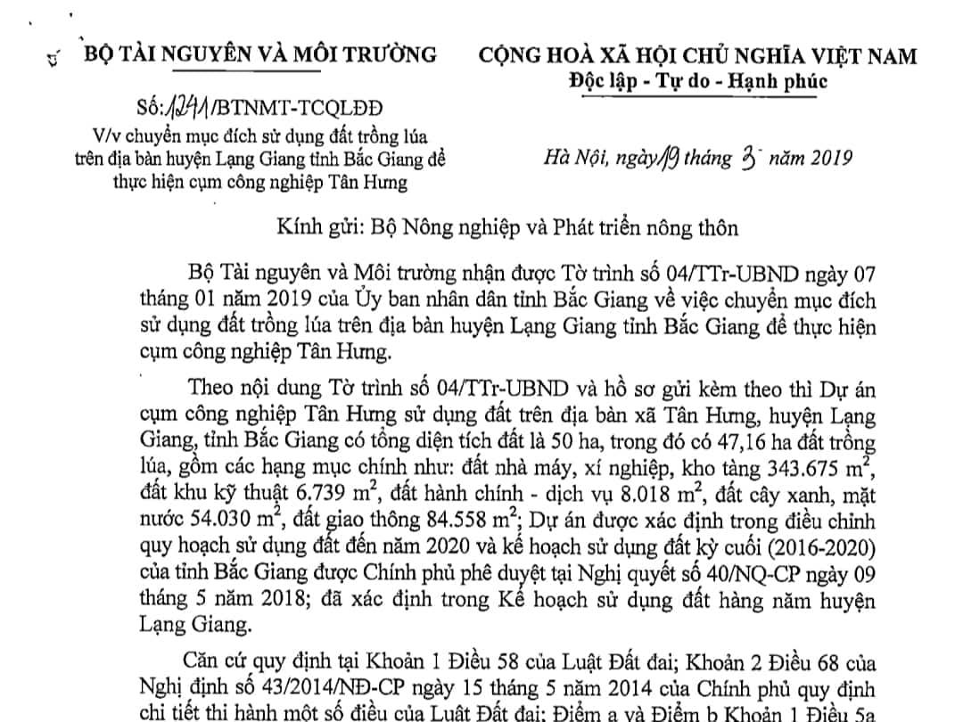 Ngày 19.3.2019 Bộ TN&MT có văn bản gửi Bộ NN&PTNT đề nghị Bộ NN& PTNT, có ý kiến bằng văn bản về điều kiện chuyển đổi mục đích sử dụng đất trồng lúa sang đất phi nông nghiệp để thực hiện dự án cụm công nghiệp Tân Hưng thuộc địa bàn xã Tân Hưng huyện Lạng Giang Tỉnh Bắc Giang có tổng diện tích 50ha. Chủ đầu tư xây dựng và kinh doanh hạ tầng cụm công nghiệp Tân Hưng là Công ty Cổ phần Lideco 1.